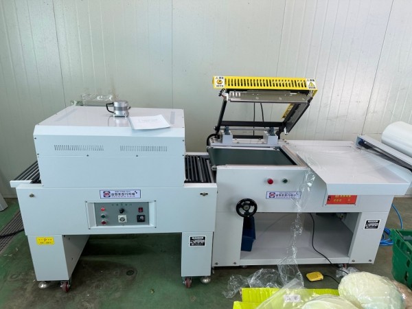 에어컴프레서가 연결되어 작동하는 L실러(L Sealer)와 수축터널로 구성된 반자동수축포장기입니다