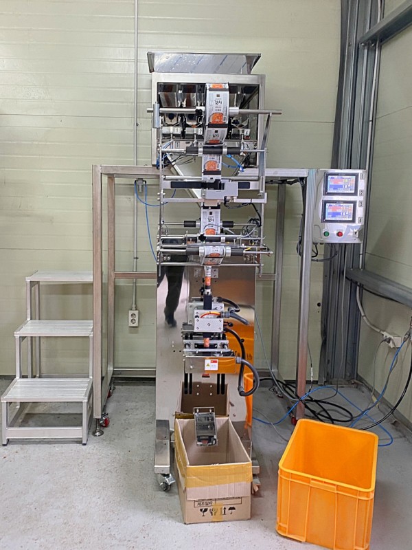 호퍼에 담긴 누룽지 제품이 4연식 자동계량기에서 계량후 수직삼면 스틱포장기에서 포장후 배출됩니다.