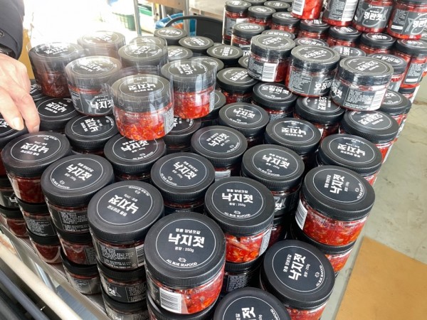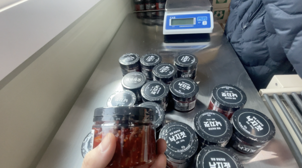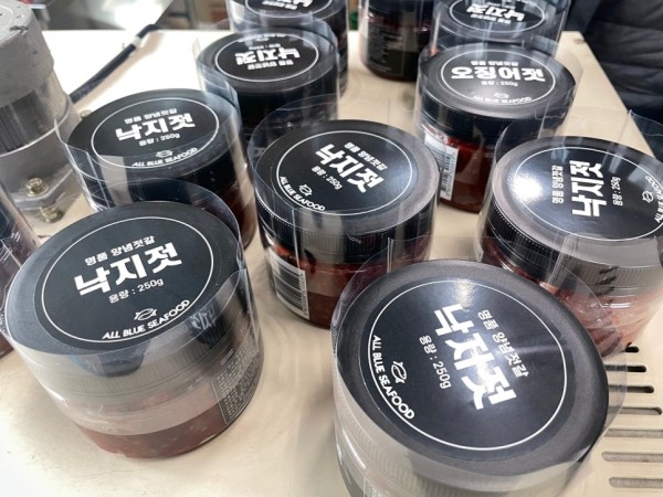 오늘은 낙지젓, 오징어젓등을 담은 용기의 식품용기의 옆면을 비닐포장하기 위해