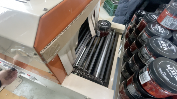 수축터널의 컨베어에 연속으로 제품을 올려놓으면 되기 때문에 히팅건 작업 같은 수작업과는 비교할수 없을만큼