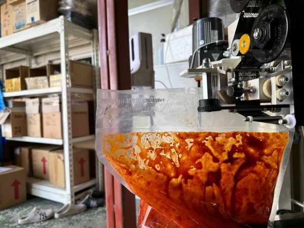 고추장 같은 소스, 국물을 담은 액상, 스탠드형 파우치를 실링하는 수직형밴드실러, 수직밴드실러는