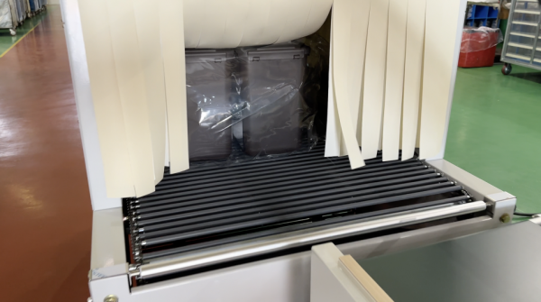 실링후 이동되는 김치통은 주문형 수축터널로 이송되어 열수축되게 됩니다.