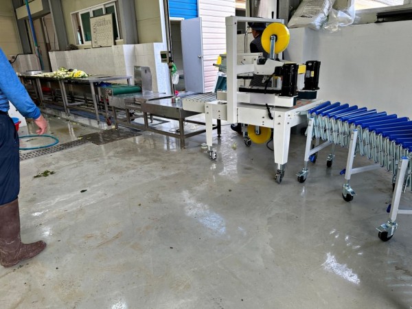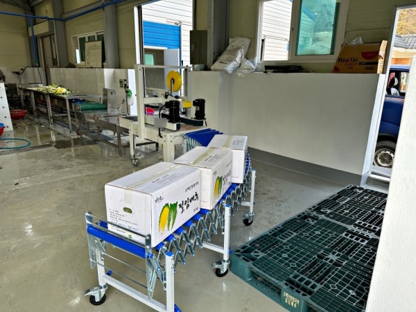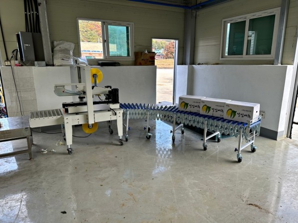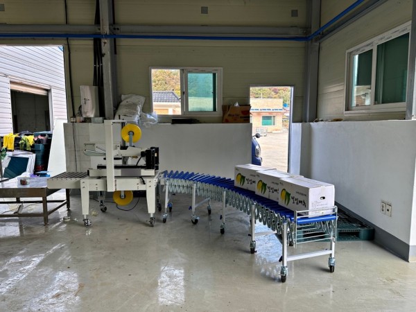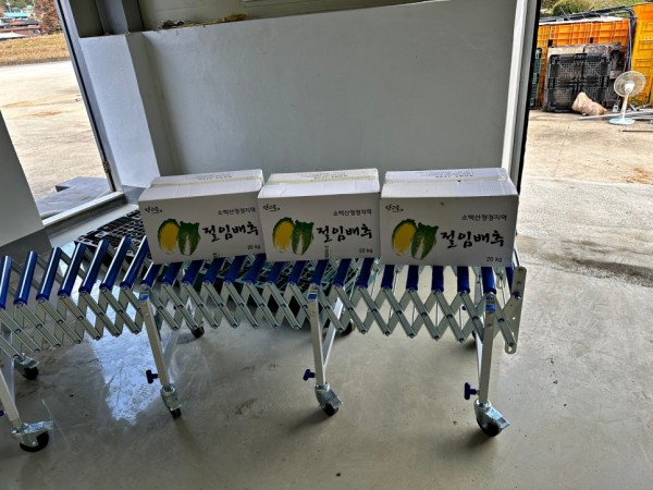 김장용 절임배추를 박스에 포장해서 테이핑작업을 하고 이동할수 있게 탭핑기, 자바라를 연결했습니다.