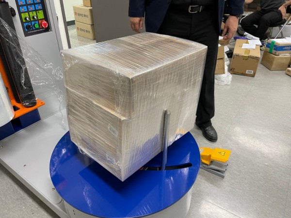 작은크기의 박스, 수하물들을 랩핑하는 주문형랩핑기로 인천공항 제1, 제2청사 한진택배에도 설치된 박스랩핑기는