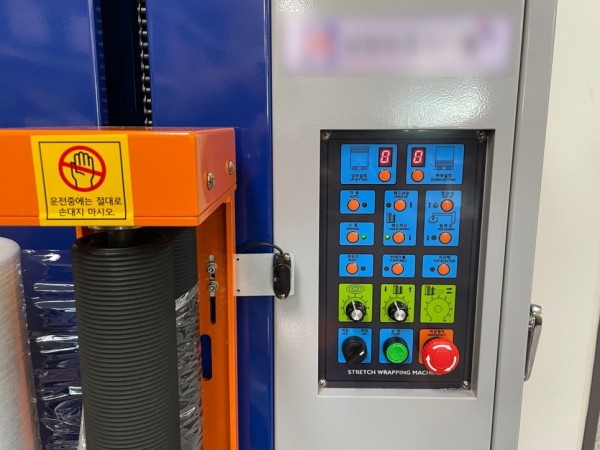 보급형 파렛트랩핑기와 동일한 PLC콘트롤러는 랩의 상, 하강속도, 턴테이블의 회전속도, 랩의 하단, 상단 감김횟수등을 조절할수가 있습니다.