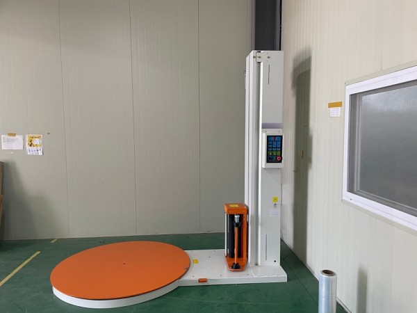 실내에 설치된 파레트랩핑기, 파렛트랩핑기입니다.