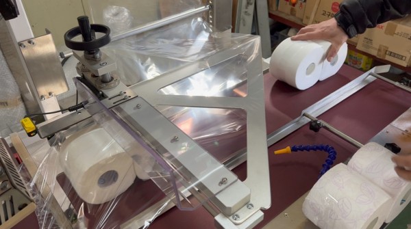 전자동수축포장기계 샘플테스트 문의로 보낸 화장지를 묶음 포장하고 있습니다.