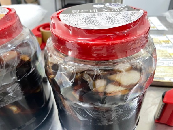 오늘 포장할 제품은 간장게장, 새우장으로 플라스틱 용기의 상단 뚜껑을 루땡포장, 수축포장하는 작업으로
