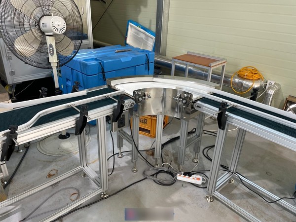 자동컨베어로 이송되는 드라이아이스는 라운드 컨베어를 통해 90도 방향을 바꿔 이동하게 되며