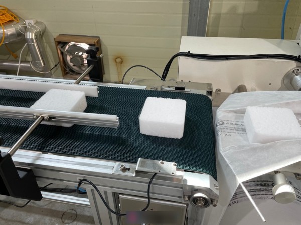 삼면포장된 제품이 컨베어로 이동해서 배출되기 때문에 1명의 작업자가 박스에 제품을 담으면 되는 드라이아이스 제작, 포장을 자동화 한 포장라인으로 기존의 삼면기와 아다치컨베어 구성에서 삼면기 자동컨베어 구성으로 변경 납품을 했습니다