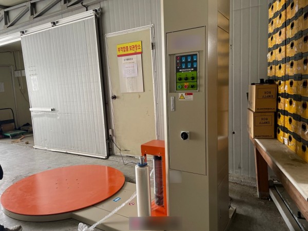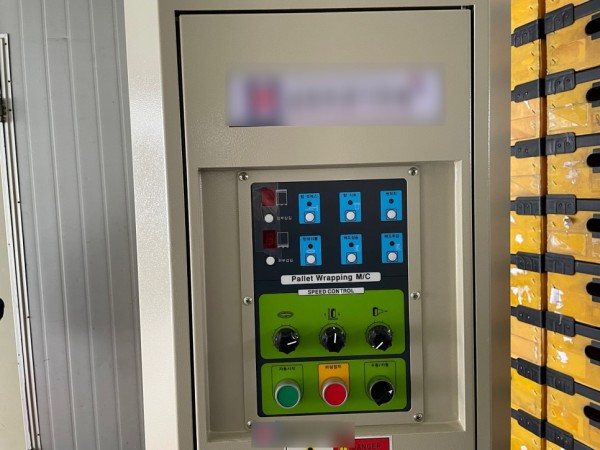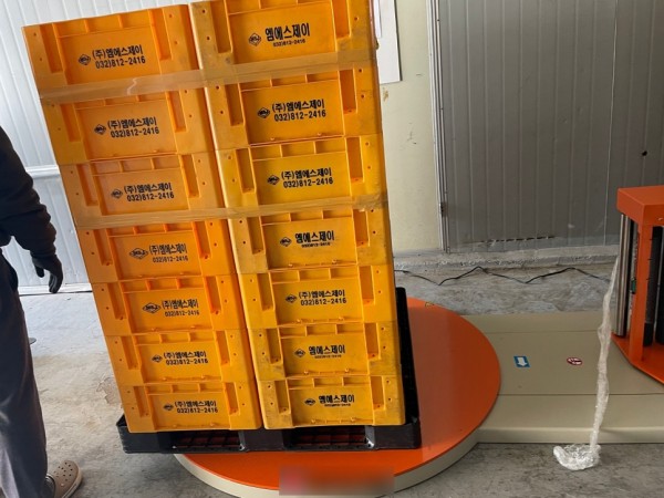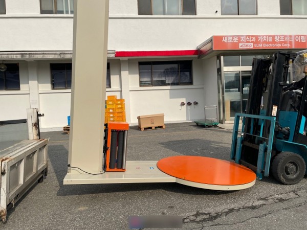 지게차로 파렛트를 올려놓고 랩을 감아주고, 자동시작 버튼을 누르면 랩핑이 자동으로 시작하고 마무리됩니다