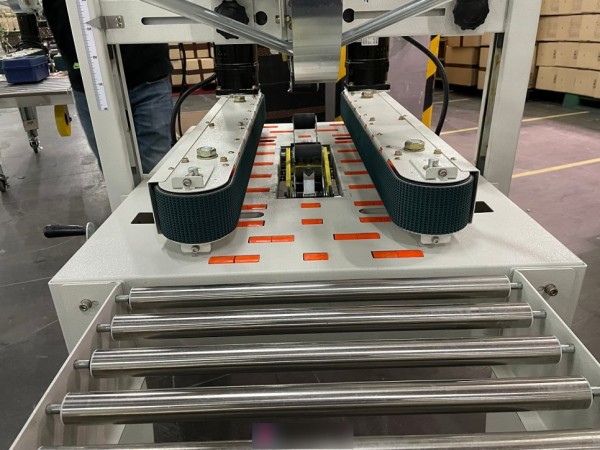 박스를 투입시키면 사이드벨트가 박스를 이동시키며, 상하 테이프 헤드가 박스를 동시에 봉함, 테이핑하게 됩니다.