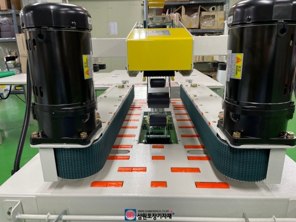 사이드벨트가 박스를 이동시키며 상하에 달린 테이프 헤드가 박스 테이핑을 합니다.