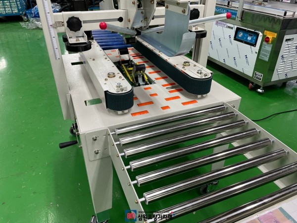 반자동박스탭핑기, 테이핑기는 박스의 크기에 따라 높이, 폭조절을 핸들로 할수 있는 테이핑기로 상하 동시에 박스 테이핑이 되며 자바라등을 연결해서 테이핑후 이동까지 자동포장라인을 구성할수 있습니다.