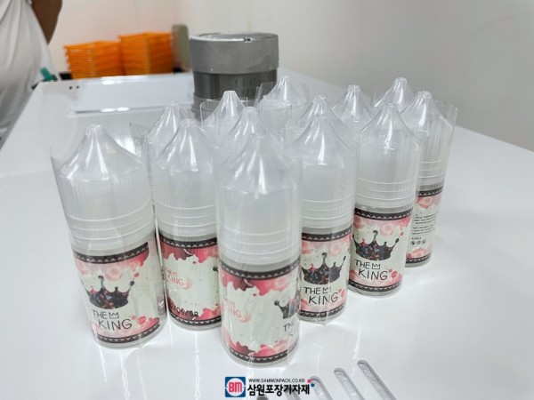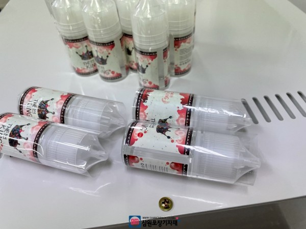 액상전자담배 용기는 손으로 잡기에도 작은 크기로 수축필름을 씌워서 열풍기나 히팅건으로 수축포장하기가 까다롭습니다.