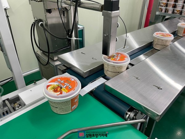 자동컨베어에서 공급되면서 동시에 생산일자, 유통기한이 프린팅된후 바로 전자동수축포장기의 컨베어로 투입이되며