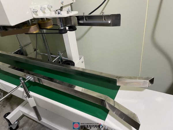 파우치에 맞게 컨베어와 밴드실러 헤드 높이를 맞추고 가이드에 맞춰 액상파우치, 스파우트파우치등 파우치를 세워서 넣으면 실링후 날인까지 완성됩니다. 연속으로 파우치를 투입해서 빠른작업이 가능합니다~!