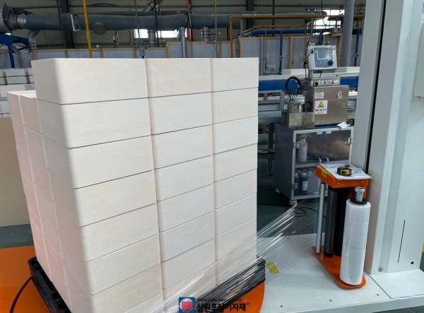 랩핑기의 자동버튼을 누르면 자동으로 높이를 감지해 제품의 하부부터 상단, 다시 하부까지 자동랩핑을 해줍니다.