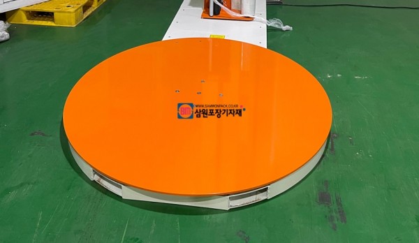 표준형 랩핑기의 턴테이블 1500mm 사이즈로, 2톤의 중량까지 커버할수 있습니다, 턴테이블의 사이즈와 중량은 필요에 따라 주문제작이 가능하며, 지게차를 사용하지 않는경우 경사판(옵션)을 사용하여 핸드자키로 파렛트를 올려 랩포장을 할수 있습니다