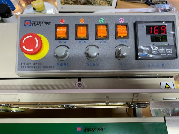 파우치의 종류와 컨베어 속도에 따라 160~210도 정도로 온도를 셋팅후 작업하시면 됩니다.