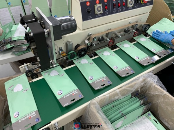 마스크포장을 위한 수평형밴드실러는 실링후 날인까지 해주는 포장기계로