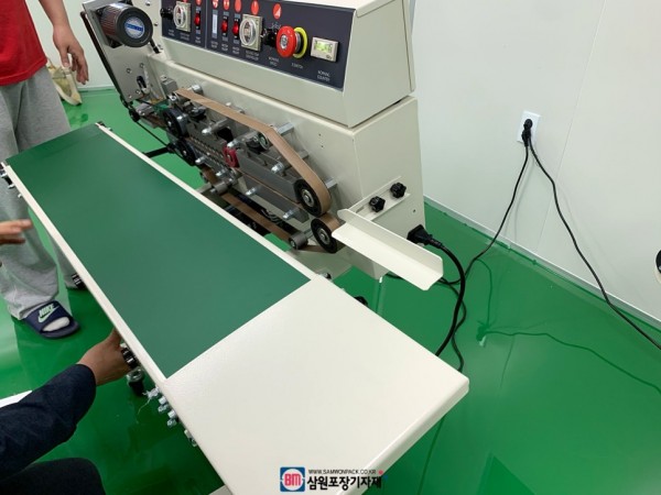 마스크제작기계(보안상 모자이크처리를 했습니다)의 배출구쪽에 컨베어와 함께 밴드실러를 설치해서 작업하시면
