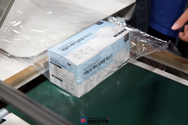반자동수축포장기로 일회용 마스크박스 포장하기