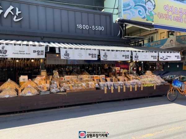 시장 진열대 너머로 포장하는 과정을 한눈에 볼수 있겠네요