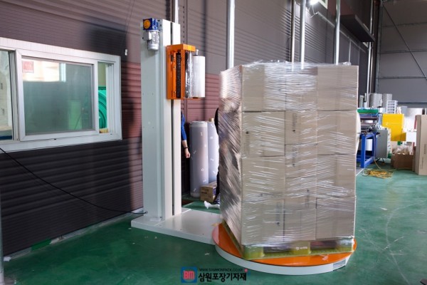파렛트위에 제품을 올리고 버튼하나만 누르면 작동부터 멈춤까지 자동으로 랩핑되는 랩핑기계입니다.
