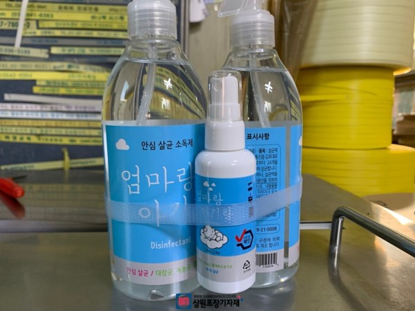 분무기 타입의 손소독제 3개를 제품을 수축포장하는 과정에서 제품이 고정이 안되어 수축과정에 시간이 많이 걸렸는데