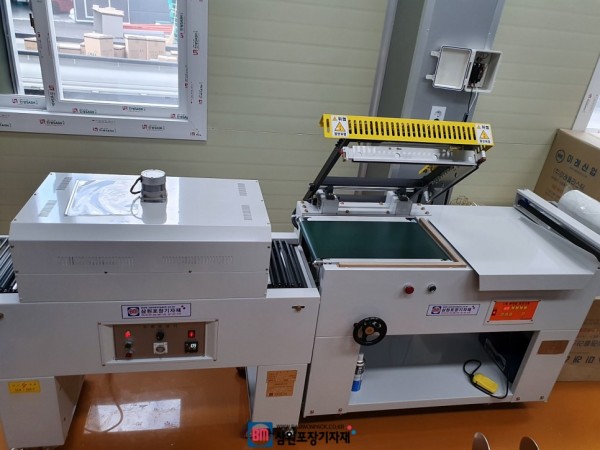수축터널(왼쪽)과 엘실러(오른쪽)으로 구성된 반자동수축포장기는 다양한 크기의 수축필름을 사용해서 여러 용기를 수축포장할수 있으며