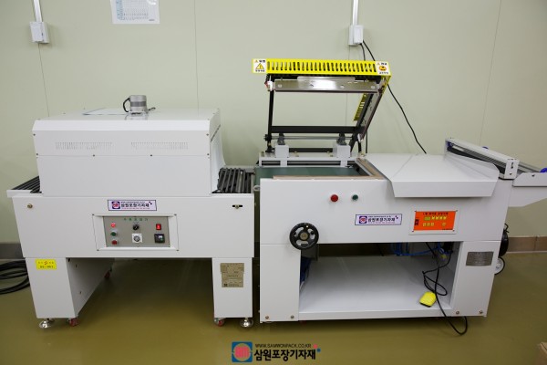 수축터널(왼쪽)과 엘실러(오른쪽)으로 구성되는 반자동수축포장기는 작업자가 제품을 수축필름에 넣어주고 엘실러 작동까지는 수작업으로 하고