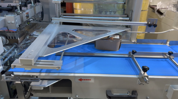 저희는 자동으로 진입하는 컨베이어와 버티컬수축포장기를 사용해 이렇게 용기를 투입해서 완전 자동으로 수축포장후 포장이 제품에 적합한지 확인했습니다.