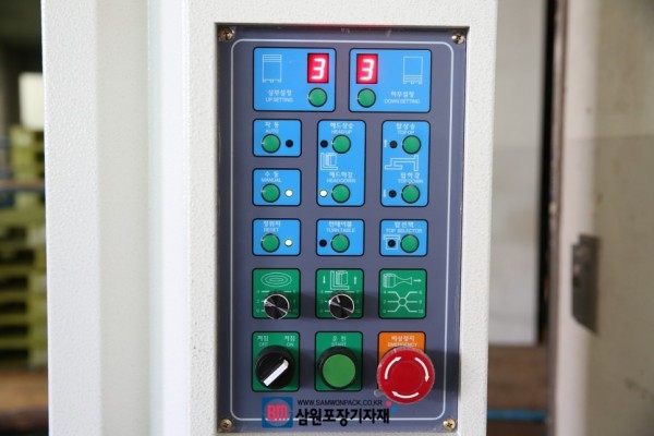 랩핑기의 컨트롤러는 상부,하부 감김횟수를 0~9회까지 설정할수 있고 자동/수동, 헤드상승하강, 턴테이블속도등을 조절할수 있는 직관적인 인터페이스입니다.