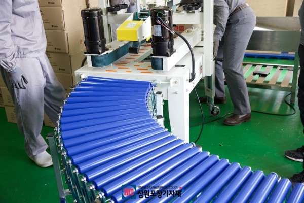 진입부에 달린 보조컨베어는(옵션) 박스를 접어 제품을 올려놓기에도 적합하고 무구동 롤러가 달려있어서 작업후 부드럽게 박스를 밀어넣을수가 있습니다. 진입부에는 보조컨베어, 배출쪽에는 자바라를 연결하시면 더욱 효율적입니다.