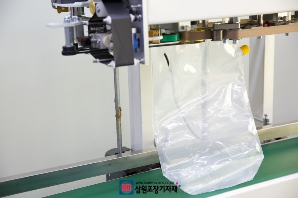 소스등 액상제품을 담은 파우치는 눕혀서 실링을 할수 없기 때문에 파우치를 세워서 실링하는 수직형밴드실러를 사용하게 됩니다.