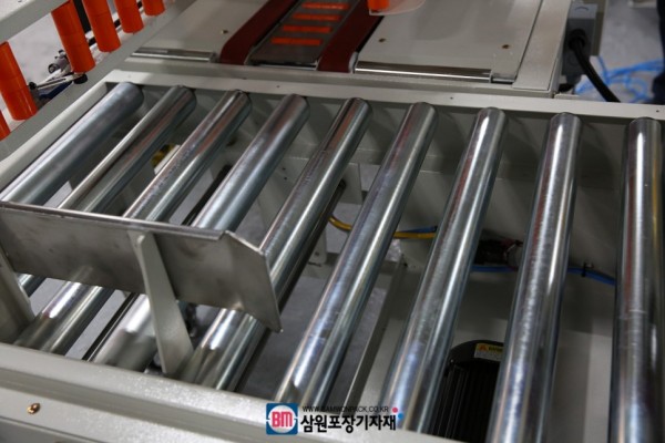 구동컨베어를 타고 이동한 아이스박스는 푸쉬기능을 통해 반대편 탭핑기로 이동해 남은 2면을 테이핑하게 되는데요