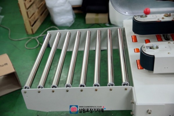 탭핑기의 진입부와 배출구 양쪽에는 박스의 진입이 원활하도록 보조컨베어(옵션)를 달수 있구요