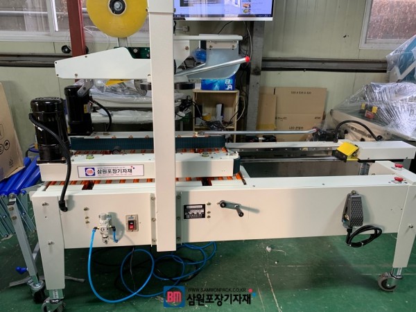오른쪽에 하부 제함기가 있어서 박스의 아래부분을 접어주고 제품담기를 한후, 왼쪽으로 이동시키면 반자동탭핑기에 의해 박스를 테이핑해주는데요