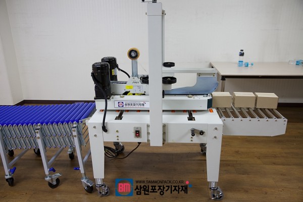 박스를 접고 물건을 넣는 작업까지 작업자가 하고 나머지 박스 테이핑을 해주는 테이핑기입니다