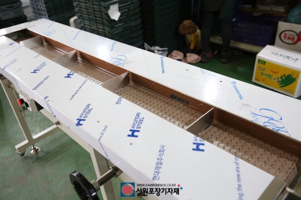 아다치방식의 컨베어는 제품의 크기에 맞게 폭조절이 가능하며, 삼면기의 작동 멈춤을 할수 있어서 제품(야채)를 올려놓으면서 작업자가 삼면기 작동을 on,off할수 있습니다