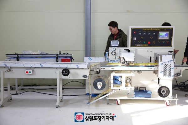 공급컨베어어(아다치컨베어)와 하단에 포장지가 걸리는 하단식 삼면기가 한셋트로 이뤄져 있으며