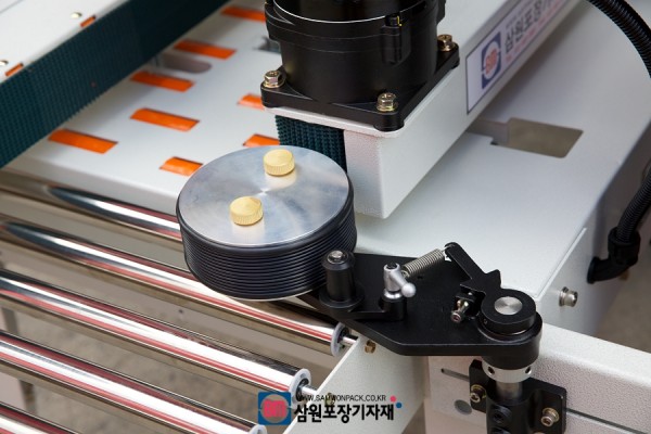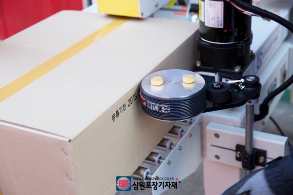 탭핑기의 배출구쪽에 롤코더를 장착하고 박스가 테이핑후 배출되면 롤코더가 돌면서 박스옆면에 날인을 하고 다시 원위치로 돌아오게 됩니다.