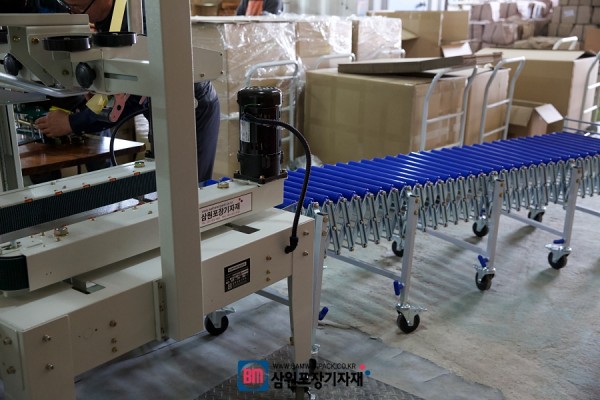 박스포장후 자동으로 박스가 이동할 장소까지 자바라를 통해 이동이 가능해서