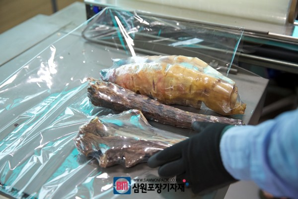 우족, 칠면조, 생선등을 훈제 또는 건조한 애견 간식을 수축포장을 통해 포장했는데요 다양한 모양이라도 수축필름이 그에 맞게 수축되기때문에 손쉽게 포장이 가능합니다.