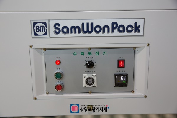 일반적으로는 수축필름에 담긴 제품을 오른쪽에서 투입하고 열풍으로 수축되면서 왼쪽 배출구로 나오는 구조입니다.