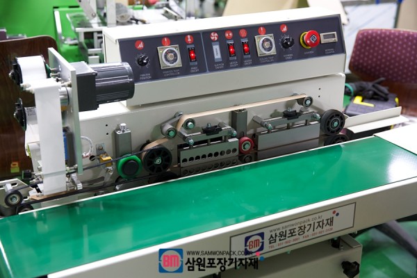 제품을 눕혀서 실링과 날인을 하는 수평밴드실러는 비닐파우치의 비닐접착과 날짜날인까지 한번에 해결할수 있는 포장기계입니다