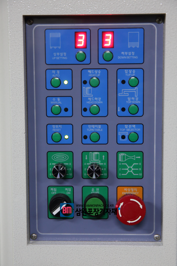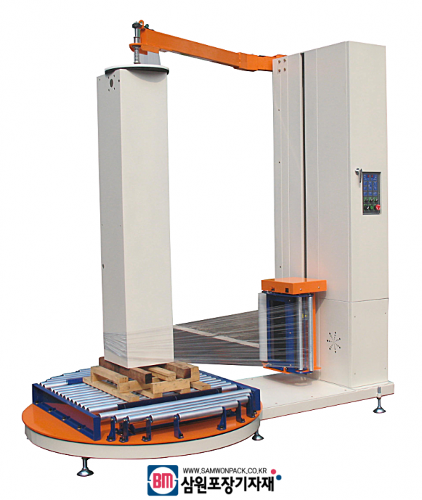 PCB컨트롤적용으로 상단,하단 감김횟수, 회전속도, 스트레치필름 상하강 속도를 제어할수 있으며, 제품감지 센서가 달려있어서 자동 또는 수동을 작업가능한 파레트랩핑기입니다.