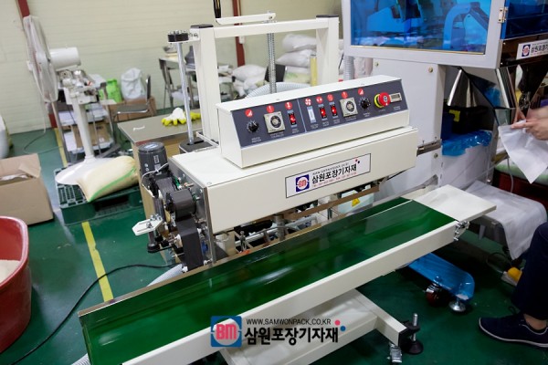 포장할 파우치에 담긴 쌀은 이제 옆에있는 밴드실러로 옮겨져 실링과 날인(제조일자, 유통기한, 까지)이 됩니다