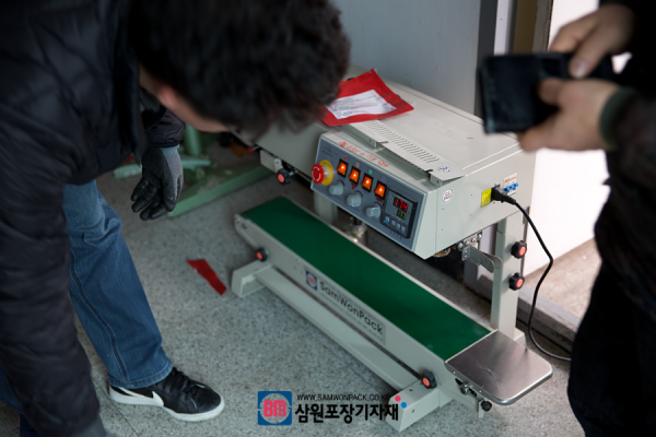 밴드실러를 작동하기 위해 예열을 해놓고 컨베어도 돌려봤습니다, 다른 자동화 포장기기도 쓰시지만 작업이 많아서 서브로 밴드실러로 실링과, 날인을 하시고 계셨네요